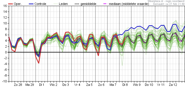 Maandag is nog een vrij knappe dag met regelmatig felle opklaringen en een middagtemperatuur van rond de 6 graden, in de nacht naar dinsdag gaat het een graadje vriezen. Dinsdagoverdag trekt de bewolking dicht en draait de wind naar het zuiden tot zuidwesten en gaat het regenen. De temperatuur loopt op naar 5 graden. De regen zet zich ook door in de nacht naar woensdag.