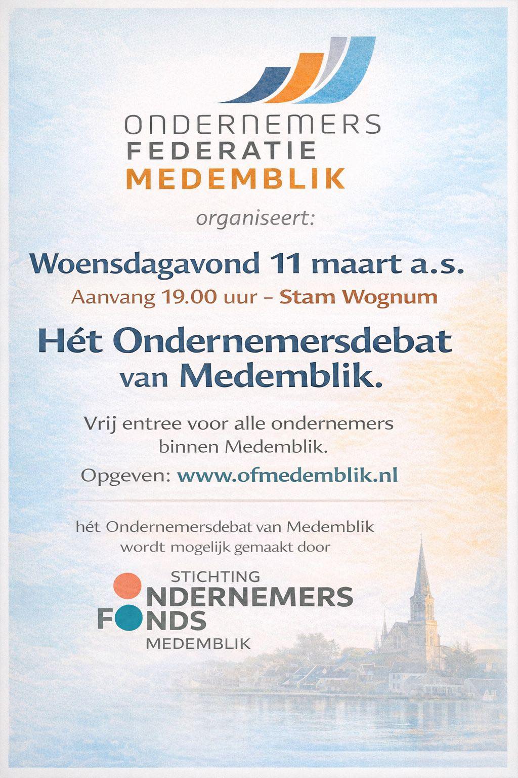 Alle ondernemers en raadsleden binnen Medemblik zijn kosteloos welkom op deze door de Stichting Ondernemersfonds Medemblik mogelijk gemaakte avond*.